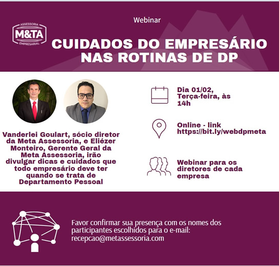 Vanderlei Goulart, sócio diretor da Meta Assessoria e Eliézer Monteiro, Gerente Geral da Meta Assessoria, irão divulgar dicas e cuidados que todo empresário deve ter quando se trata de Departamento pessoal.